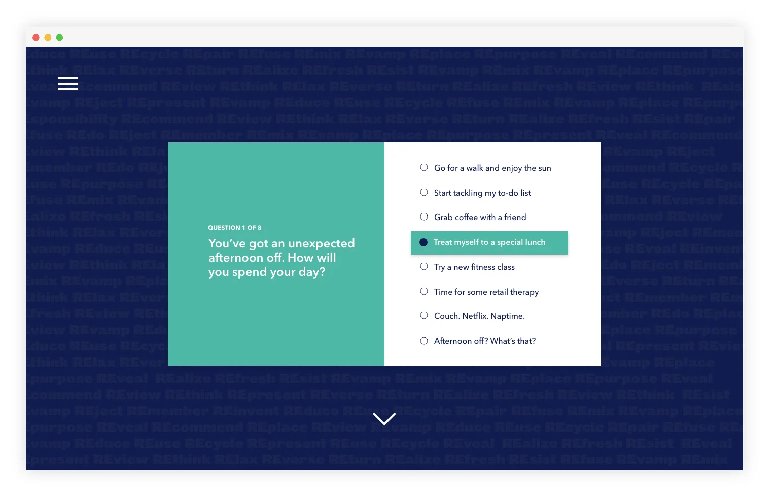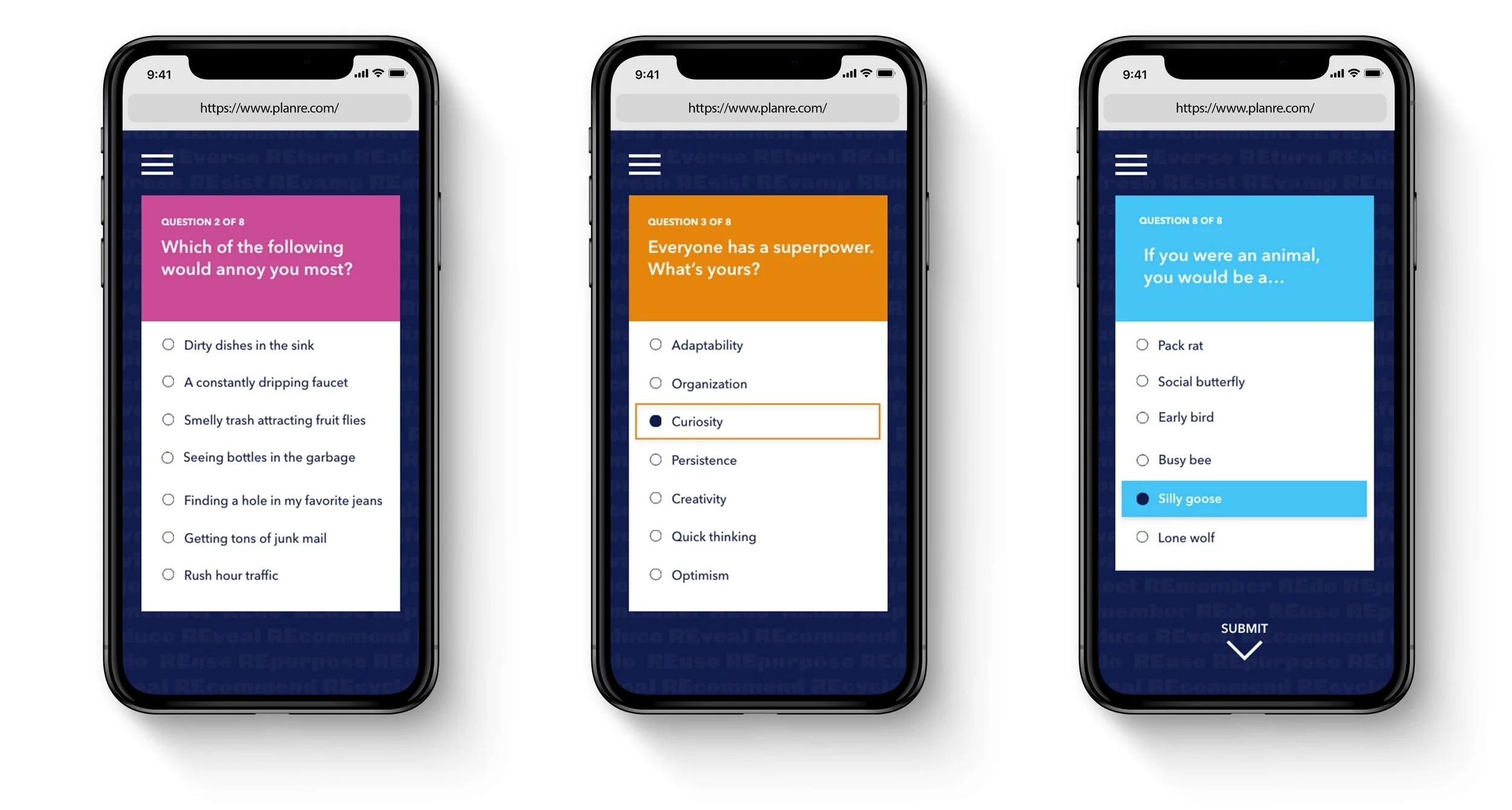 “Zero-waste” is an admirable goal, but going for it all-or-nothing seems like an impossible challenge. Plan RE is a tool to help people discover easy ways adapt their habits and move towards “less-waste.” I designed a prototype microsite with a quiz that gives custom lifestyle tips and campaign materials to promote the project.